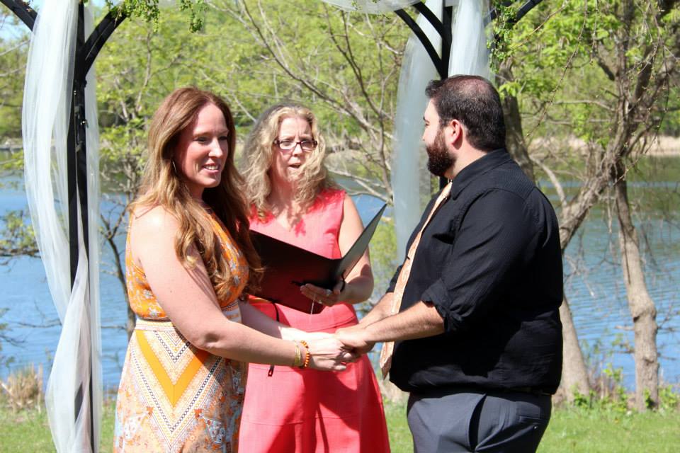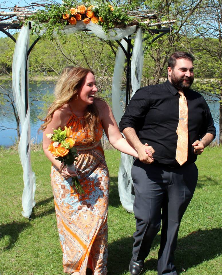 Heidi (a co-worker) and Brandon came to me to perform their ceremony about 2 weeks before they tied the knot. They wanted simple and it was just going to be the 2 of them as they were planning something bigger at a later date. I sent Heidi a couple of my favorite ceremonies, as I really didn’t want it to be a generic civil ceremony. I wanted them to look back and be happy with the words and the meaning behind them. They shared with family and that simple little ceremony for 2 grew to included the immediate family, their children, and a few close friends. They planned and got everything together in a very, VERY short time! It was beautiful! The day was spectacular and her sisters put together the beautiful trellis to marry under. I love their casual, laid back attitude – They were relaxed and enjoyed their moment. Thank you Heidi & Brandon! Much happiness in your future together.